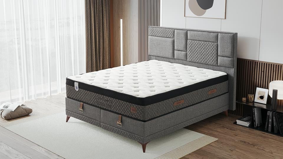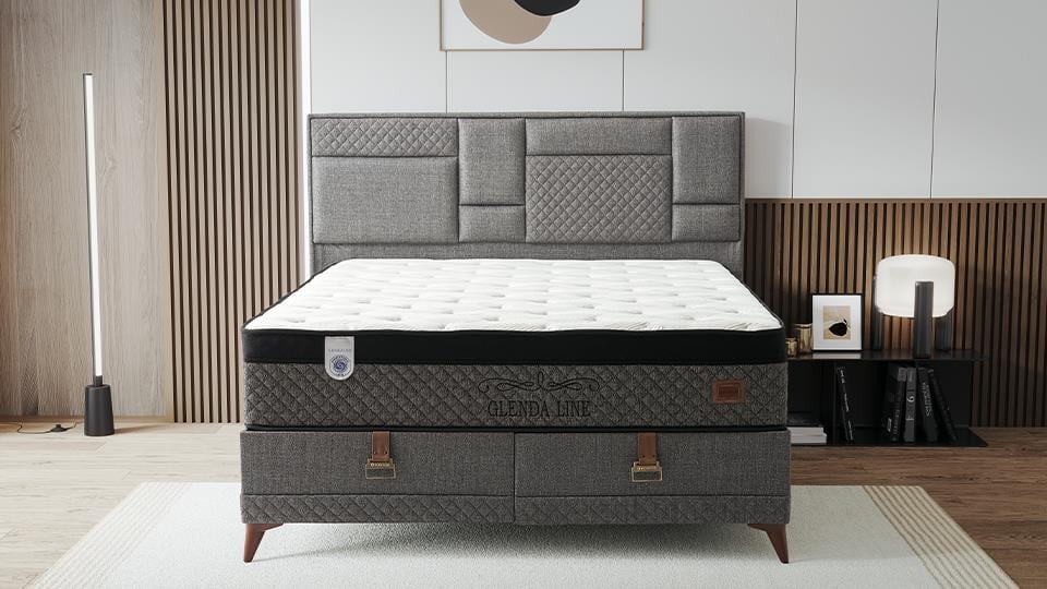 With its modern design and asymmetrical quilted patterns, Glenda Set adds an eye-catching aesthetic to the bedrooms with its special design, while making life easier thanks to its large inner volume base that provides extra storage space. You will experience the pleasure of having a privileged design that makes you feel the texture of the past and the future with a di¬erent story in every detail. Are you ready for the unique comfort of sleep with the hidden pad layer of the mattress?
